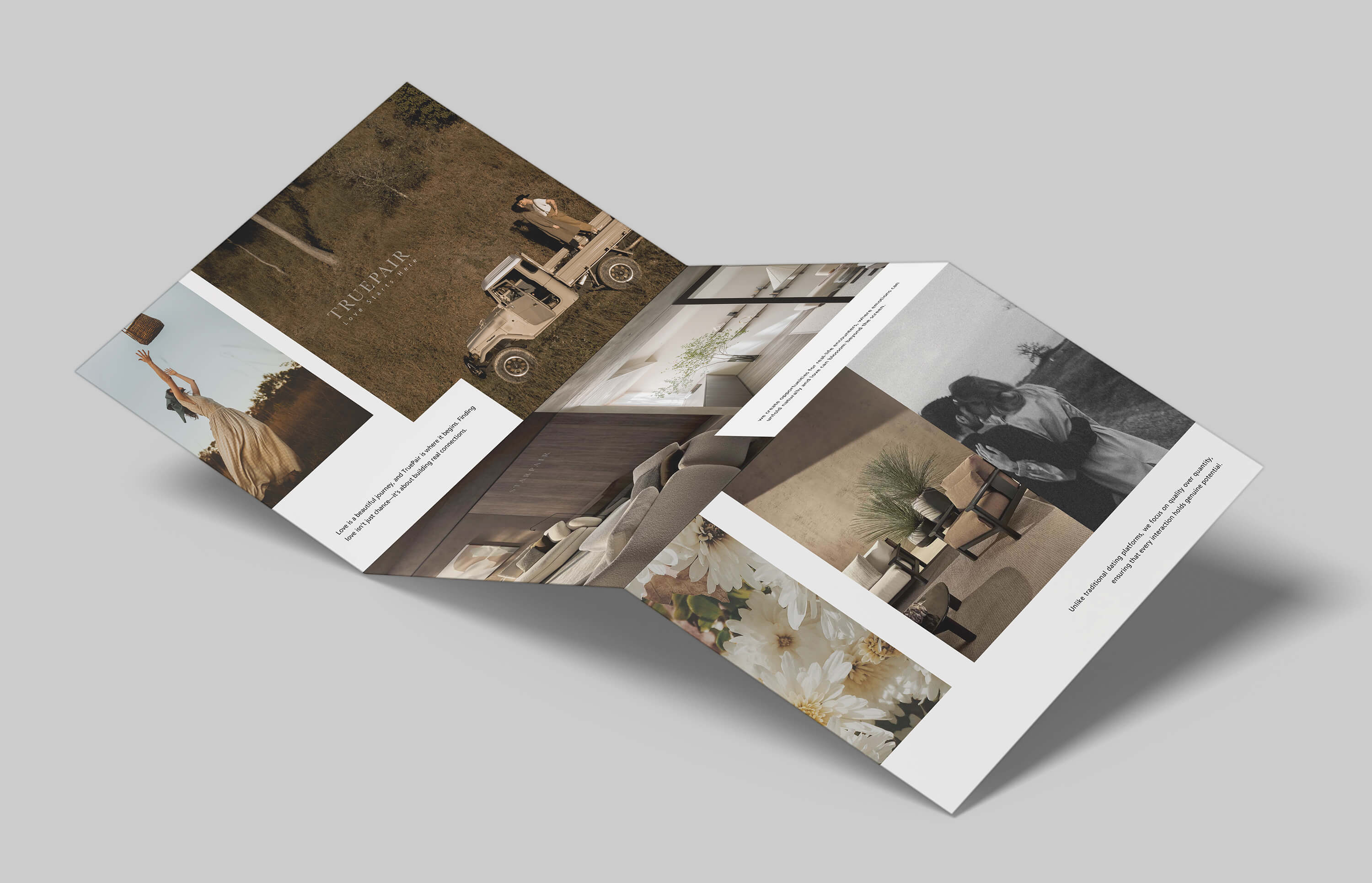此項目是針對高端的婚戀品牌進行宣傳製作物的設計規劃,此品牌主要是以女性客戶為主,協助找到合 適的結婚伴侶並共組家庭,在設計上我們透過視覺創意呈現具有獨特性的影像,傳遞溫暖與自在的幸福 感,讓鮮明的視覺語言強化品牌風格。